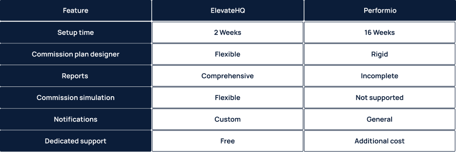 In this article, we’ll cover every unique feature that sets ElevateHQ as a potent alternative to Performio. We’ll compare set-up time, commission plan designer, reports, notifications, and more.